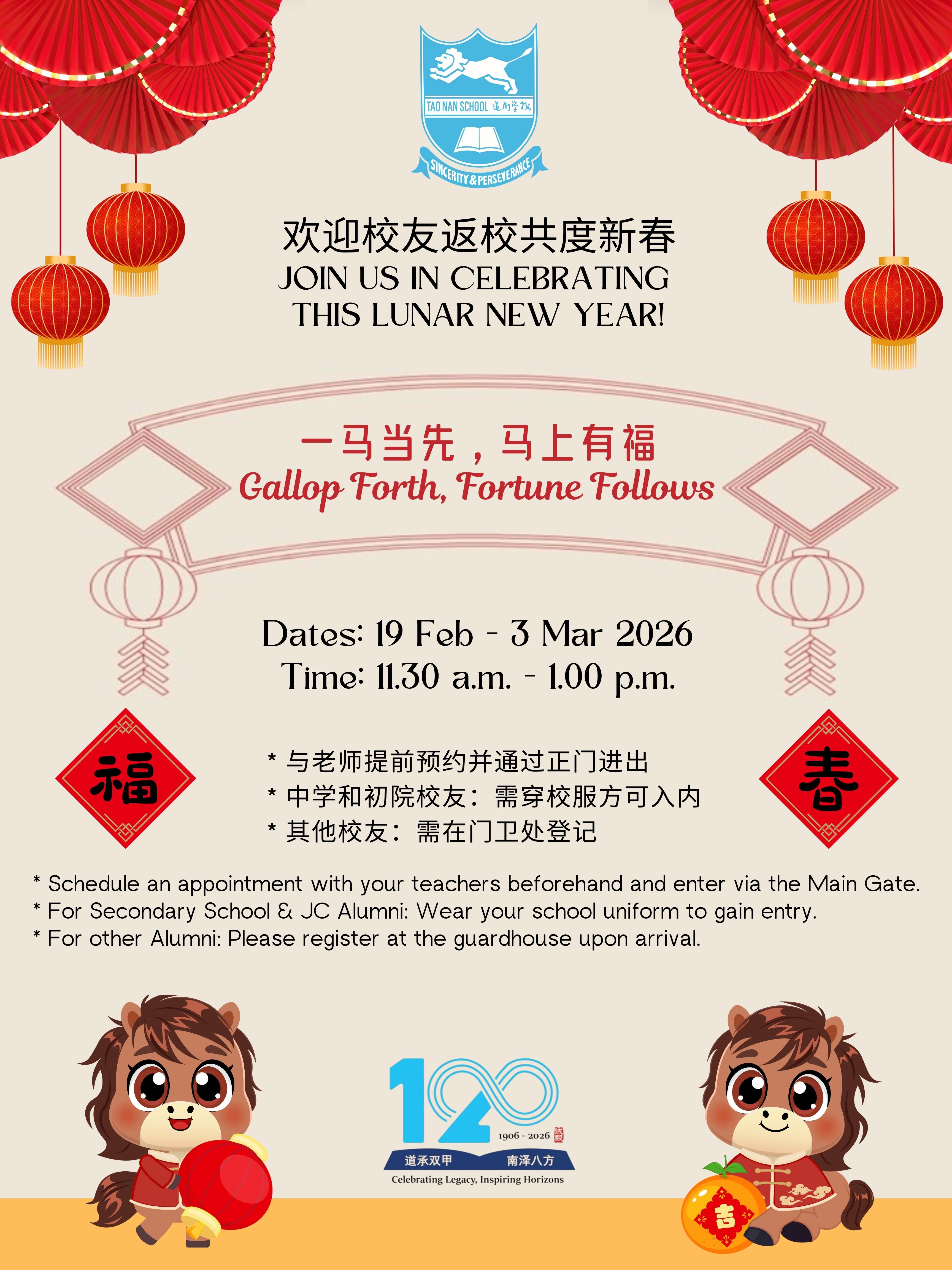 Since its founding in 1906, Tao Nan School has upheld its motto of Sincerity and Perseverance, and embraced the vision of Love to Learn, Learn to Love, nurturing generations of students. In 2026, Tao Nan School will be celebrating 120th Anniversary. Thus, to commemorate this historic milestone, we are launching a call for submissions for the 120th Anniversary Logo and Theme and warmly invite all students, alumni, staff and parents to participate.