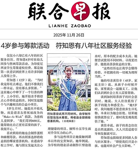 Our Primary 6 student, Julia Foo, began participating in fundraising at age four and has continued her community service experience during her PSLE preparation year.